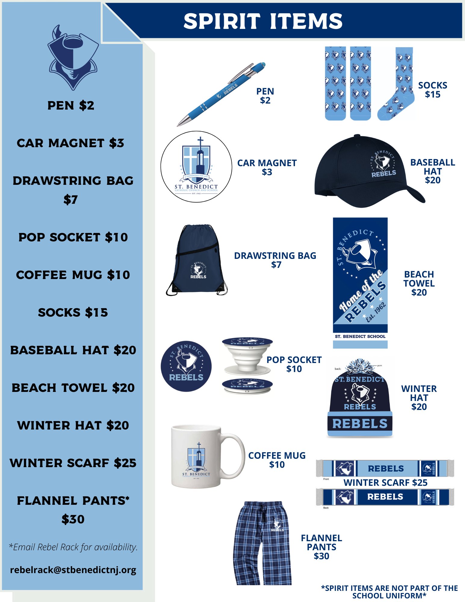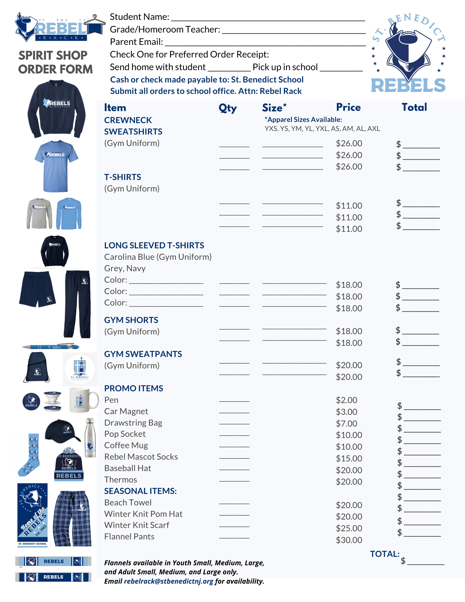 All Rebel Rack spirit shop orders can be sent in to the School Office in an envelope with payment marked to the attention of Mrs. Damiano.